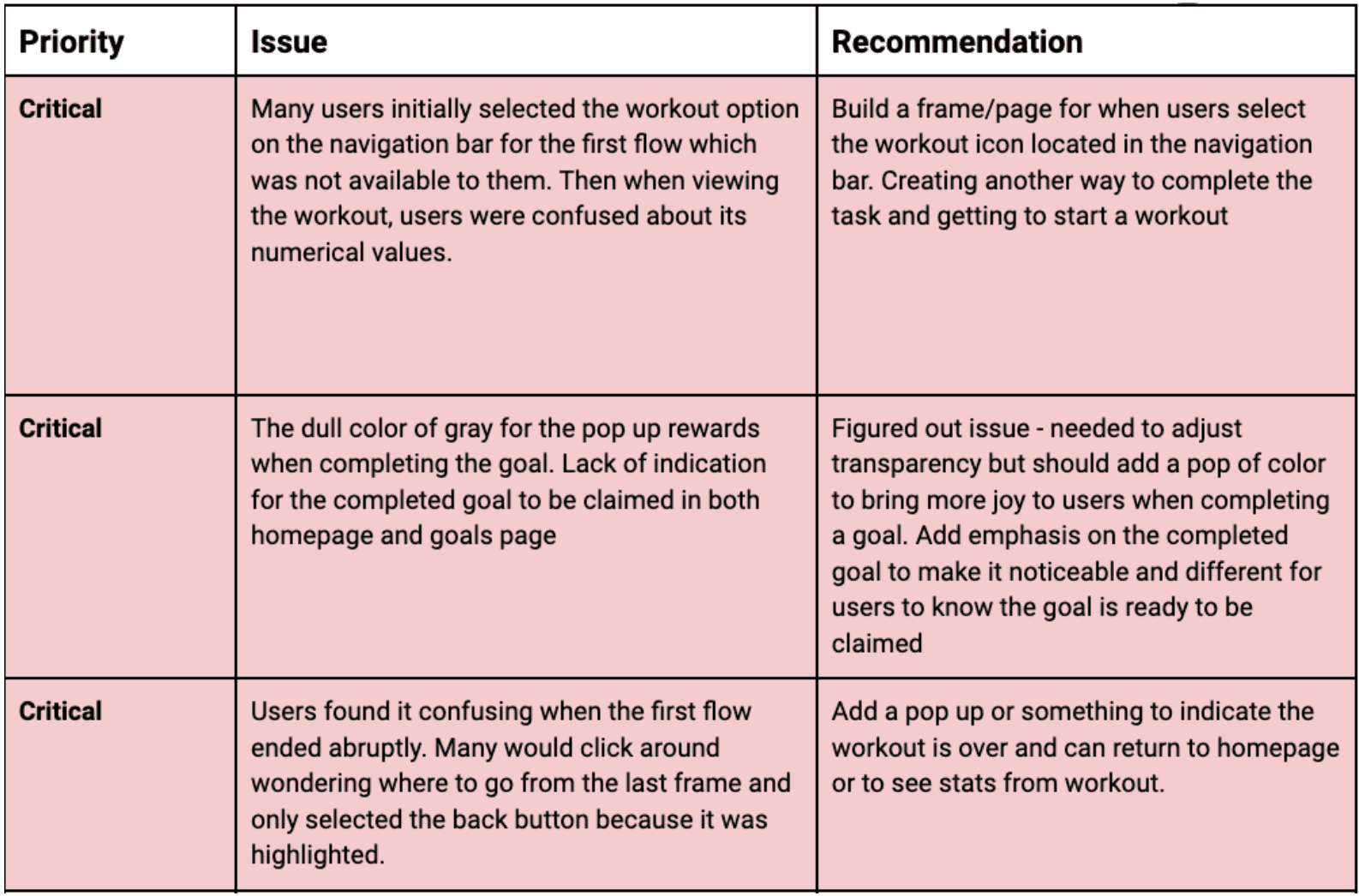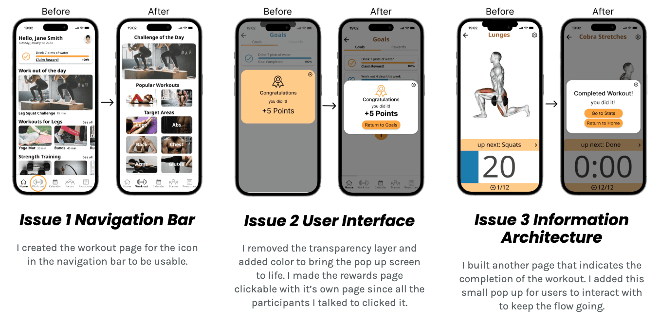 I conducted usability testing to evaluate how users interacted with the app and identify areas for improvement. I recruited five participants through Slack and my personal network and conducted sessions via Zoom. Participants were asked to complete three key tasks while I observed their behavior and gathered feedback. The main usability challenges identified are summarized above.