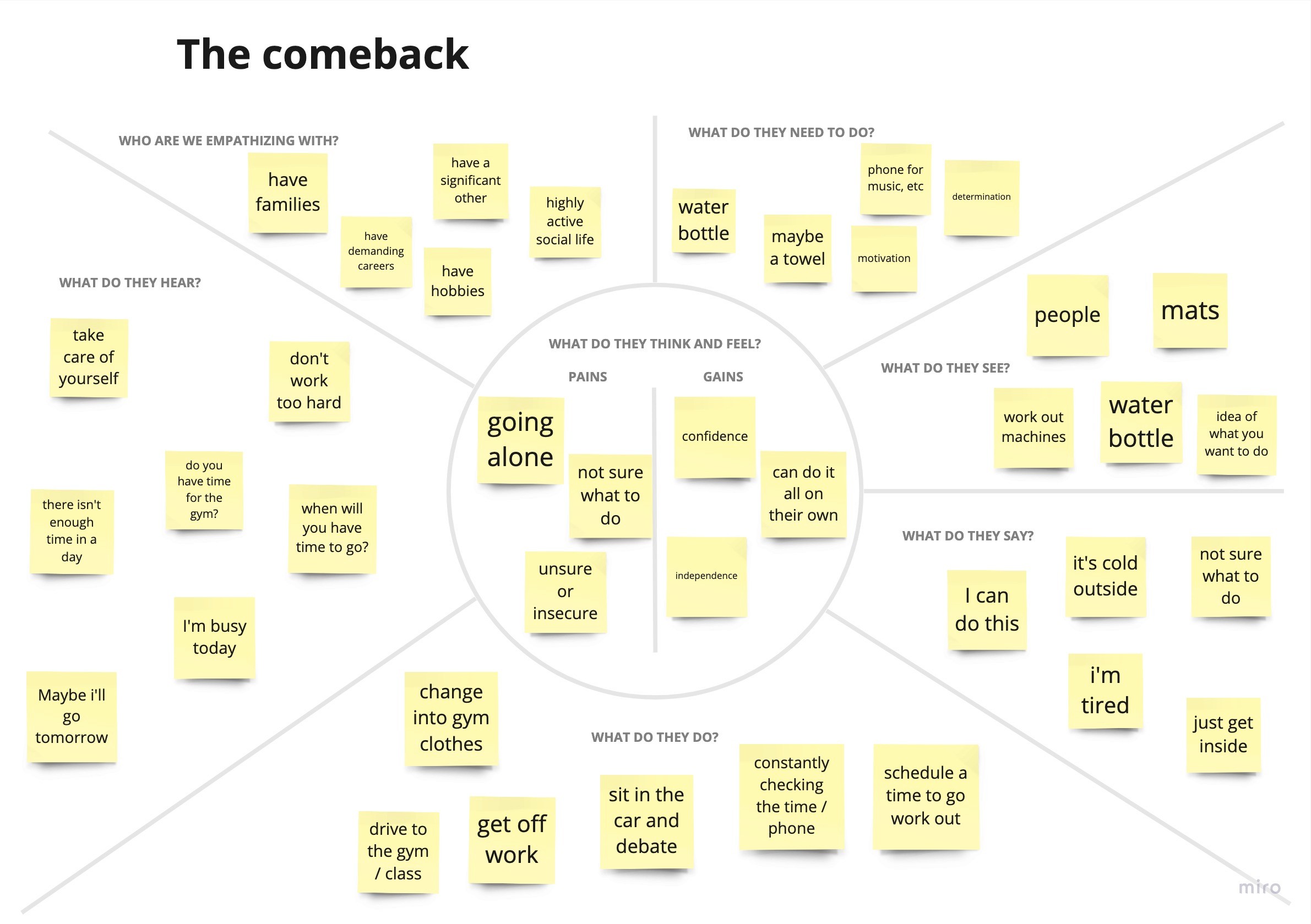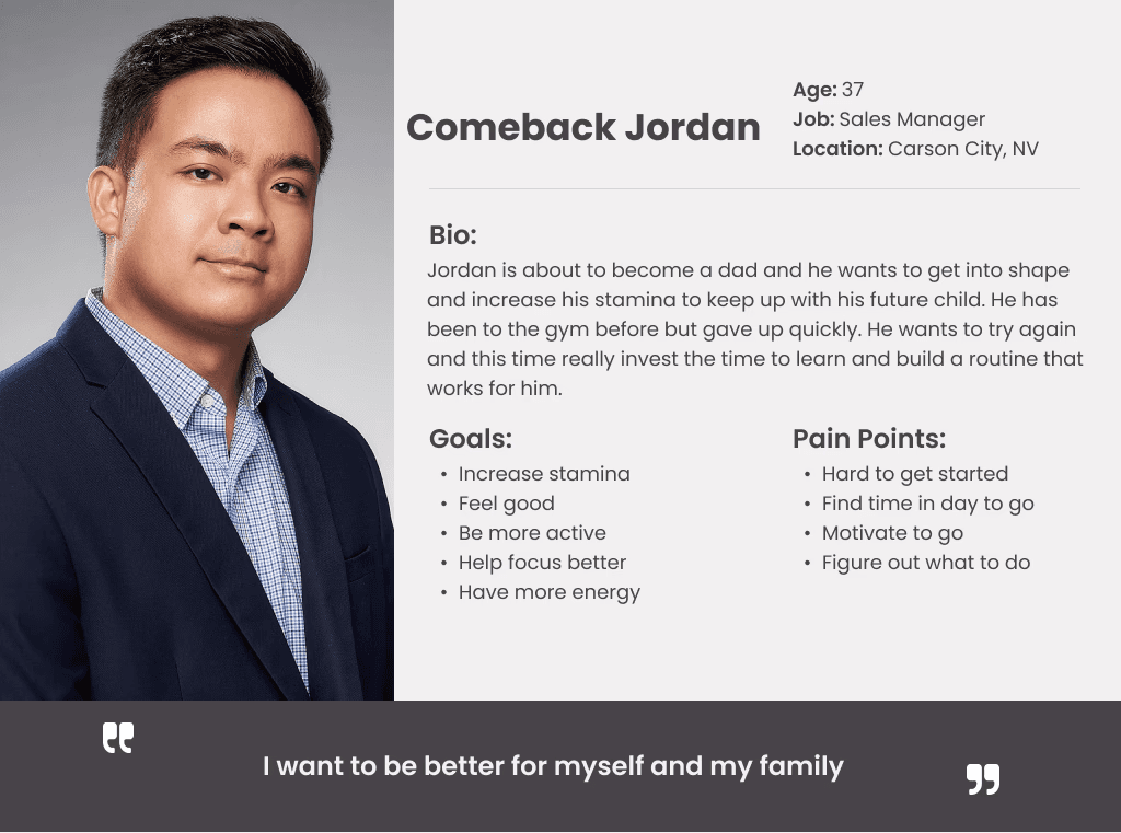 I conducted both secondary and primary research to understand user needs and gaps in existing fitness solutions. Analysis of current apps and online content revealed common pain points, including difficulty following workouts, unclear guidance on proper form, and lack of strong motivation systems. I then recruited participants through screener surveys and conducted 1:1 interviews, synthesizing insights into affinity maps and personas. Key themes emerged around lack of motivation, limited foundational knowledge, and uncertainty in starting or maintaining a routine. These findings shaped trainON’s focus on delivering a more guided, structured, and motivating fitness experience.